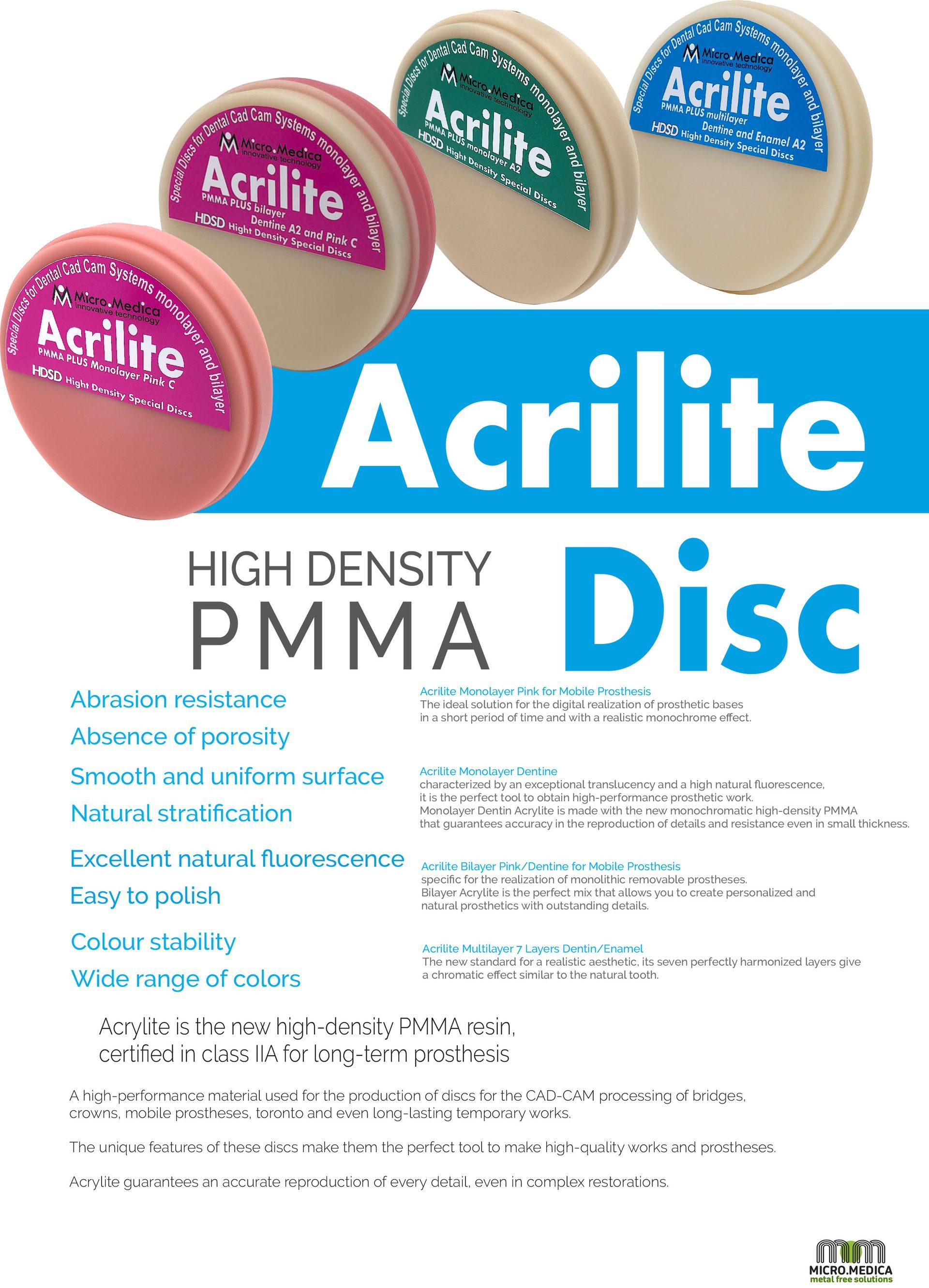 Acrilite is the new high-density PMMA resin certified in class IIA for long-term dentures. A high-performance material for making discs for the CAD-CAM processing of bridges, crowns, removable dentures, torontos and even long-term temporary work.