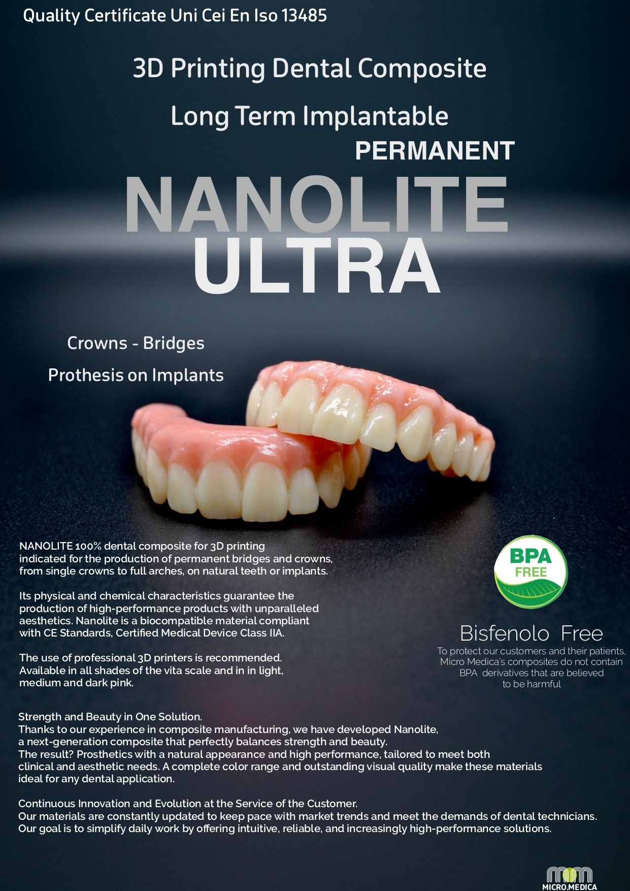 NANOLITE 100% dental composite for 3D printing indicated for the production of permanent crowns and bridges, from single crowns to full arches, on natural teeth or implants.