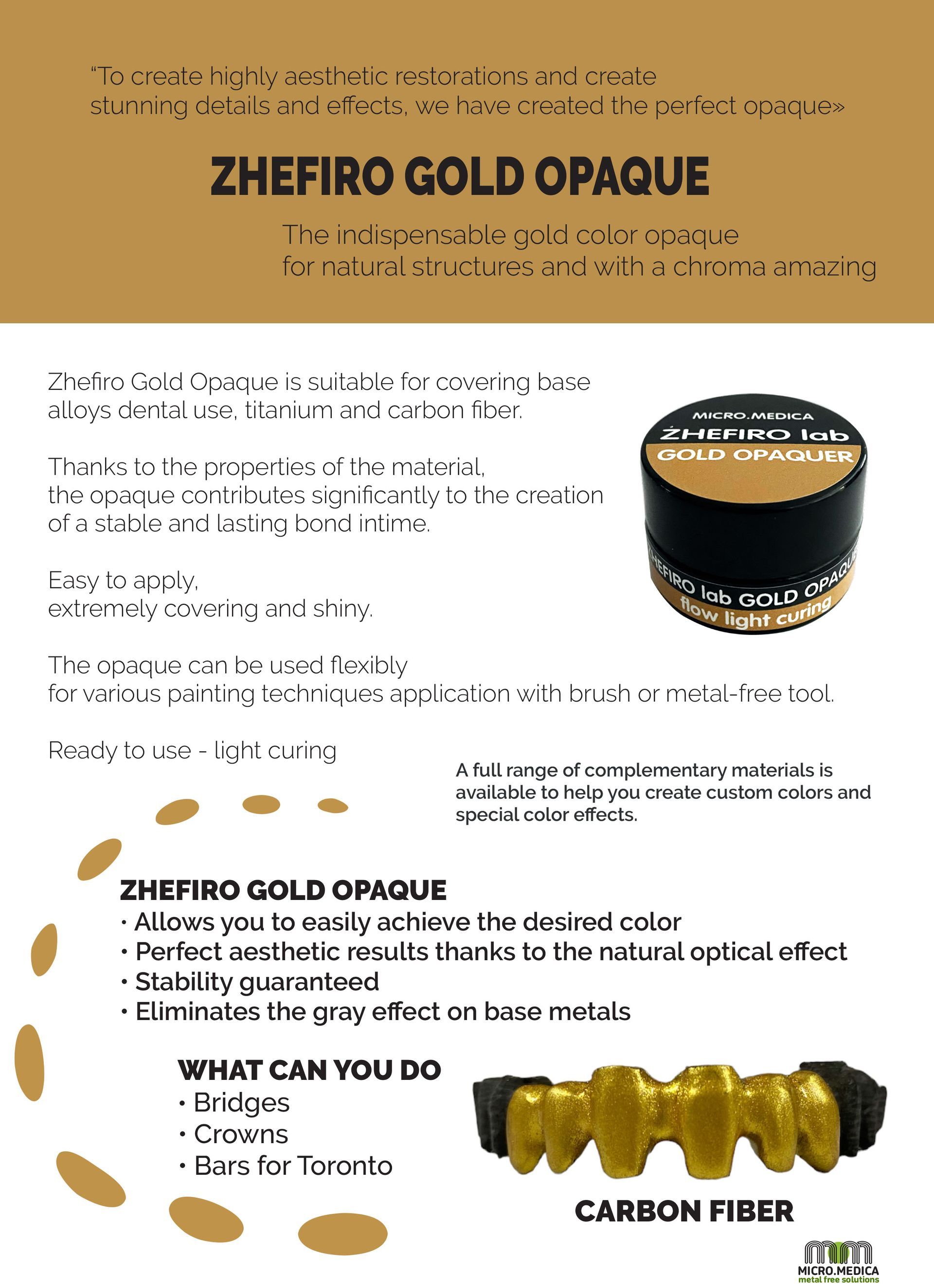 Zhefiro Gold Opaque is suitable for covering vile dental alloys, titanium and carbon fibre.