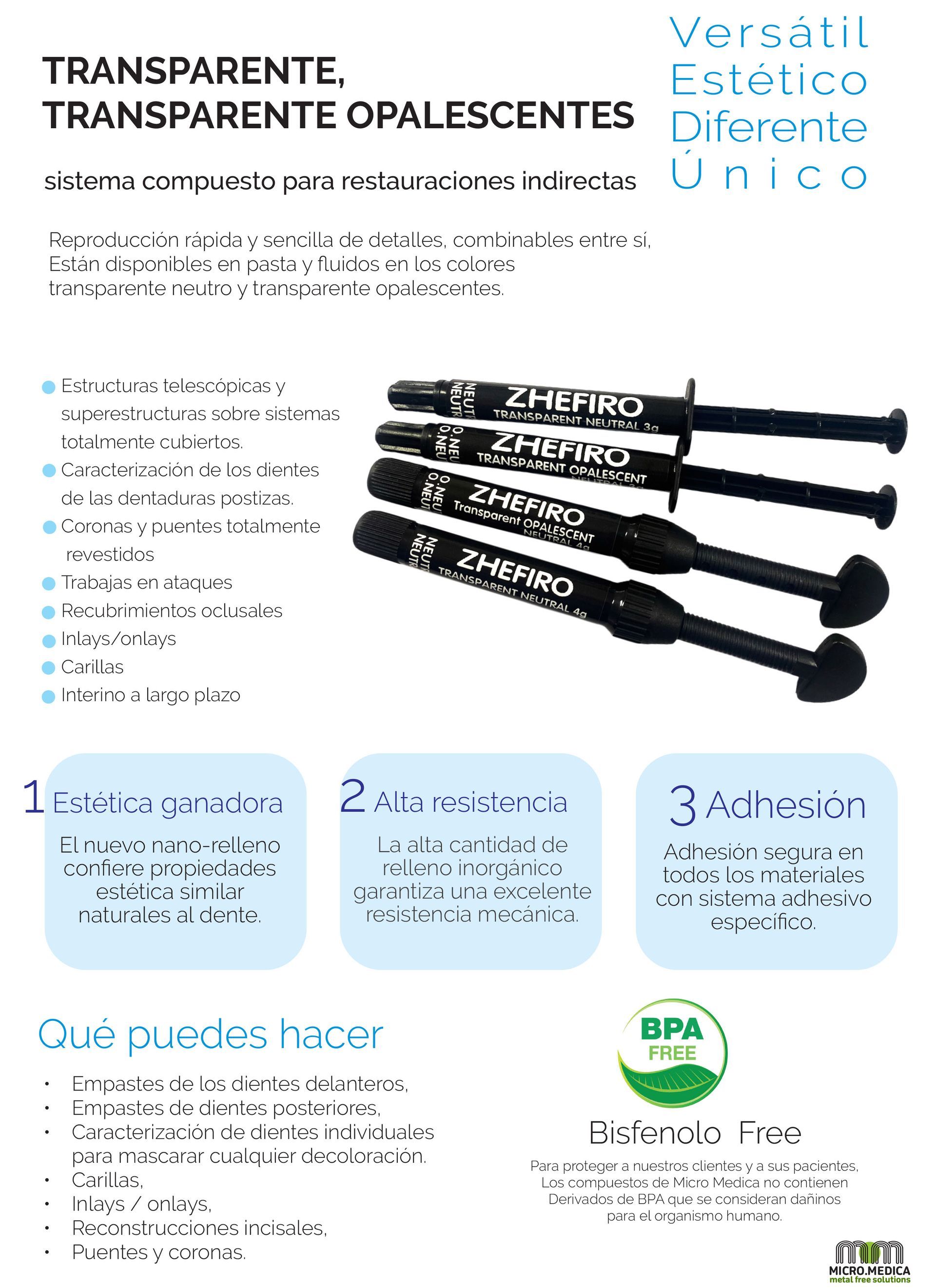 Sistema de composite opalescente transparente ZHEFIRO para restauraciones directas