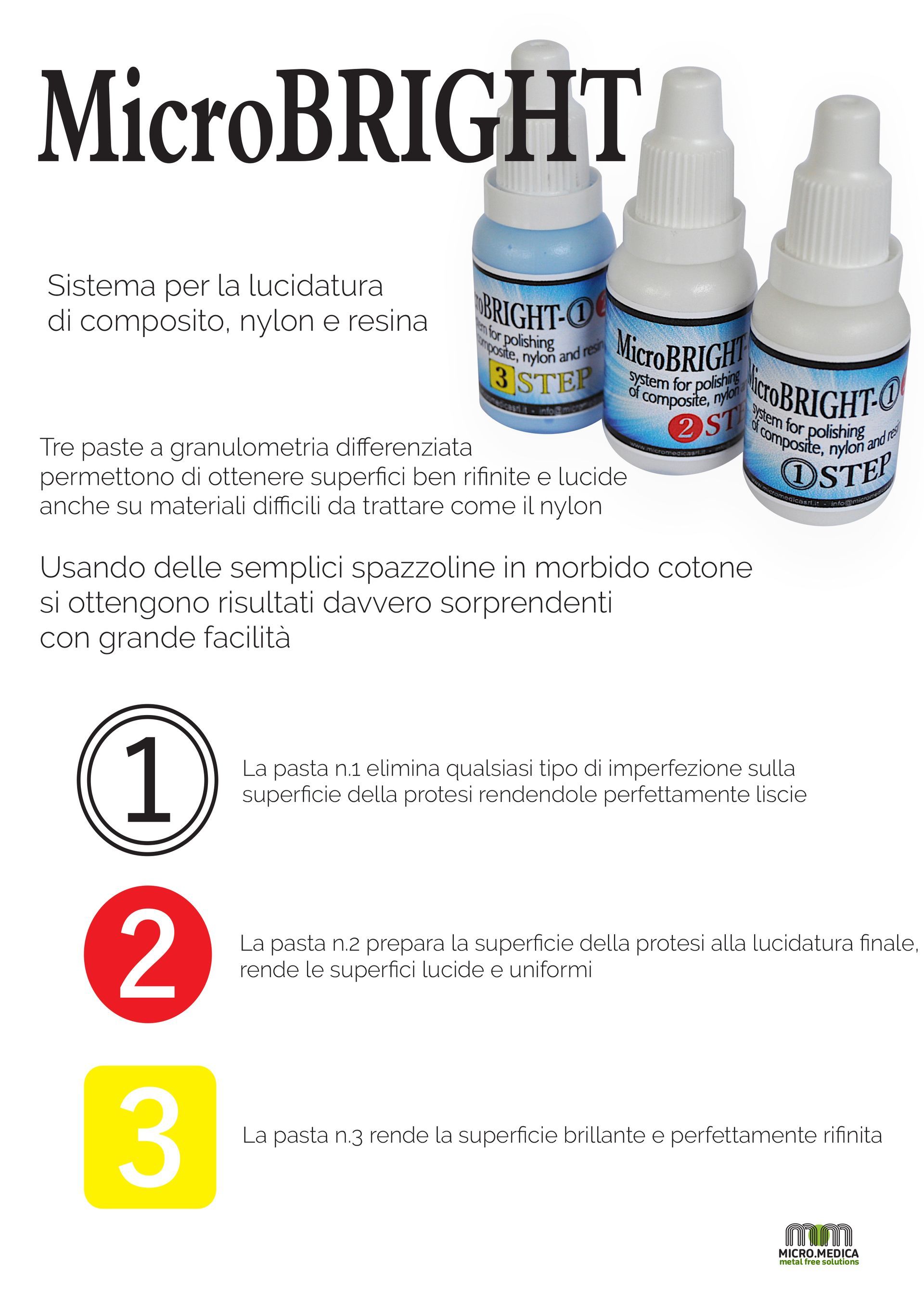 Sistema per la lucidatura di composito, nylon e resina. Tre paste a granulometria differenziata permettono di ottenere superfici ben rifinite e lucide anche su materiali difficili da trattare come il nylon. Usando delle semplici spazzoline in morbido cotone si ottengono risultati davvero sorprendenti con grande facilità.