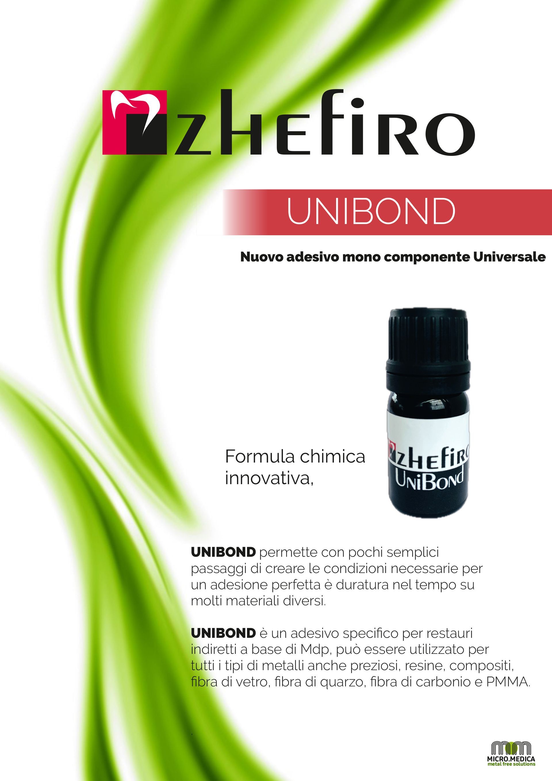 un adesione perfetta è duratura nel tempo su molti materiali diversi. UNIBOND è un adesivo specifico per restauri indiretti a base di Mdp, può essere utilizzato per tutti i tipi di metalli anche preziosi, resine, compositi, fibra di vetro, fibra di quarzo, fibra di carbonio e PMMA.